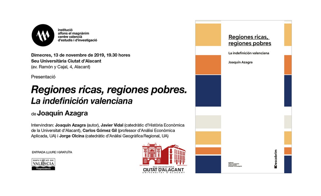 La Institució Alfons el Magnànim - Centre Valencià d’Estudis i d’Investigació presentará en Alicante el miércoles 13 de noviembre, a las 19.30 horas, el libro Regiones ricas, regiones pobres. La indefinición valenciana, de Joaquín Azagra. El acto, organizado con la colaboración de la Universitat d’Alacant, tendrá lugar en la Sede Universitaria Ciudad de Alicante (avda. Ramón y Cajal, 4), y en él participarán, junto al autor, Javier Vidal (catedrático de Historia Económica de la UA), Carlos Gómez Gil (profesor de Análisis Económico Aplicado, UA) y Jorge Olcina (catedrático de Análisis Geográfico Regional de la UA). El libro lo ha publicado el Magnànim en la colección «Descobrim», dirigida por Antoni Ariño.