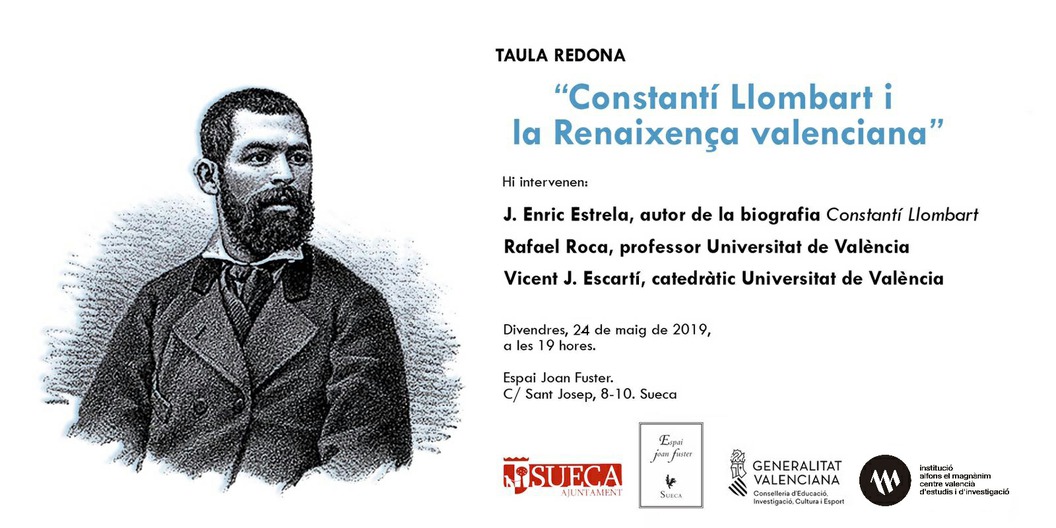 L'Espai Joan Fuster de Sueca (carrer Sant Josep, 8-10) amb la collaboració de la Institució Alfons el Magnànim ha organitzat una taula redona al voltant del tema Constantí Llombart i la Renaixença valenciana, que tindrà lloc el divendres 24 de maig, a les 19 hores, amb la participació d'Enric J. Estrela (subdirector del Magnànim i autor de la biografia Constantí Llombart), Rafael Roca (professor Filologia UV) i Vicent J. Escartí (catedràtic Filologia UV). Amb motiu de la publicació pel Magnànim de la biografia Esperit de valencianisme. Constantí Llombart (1848-1893), obra d'Estrela, els investigadors reflexionaran sobre el paper de Llombart en la Renaixença valenciana.