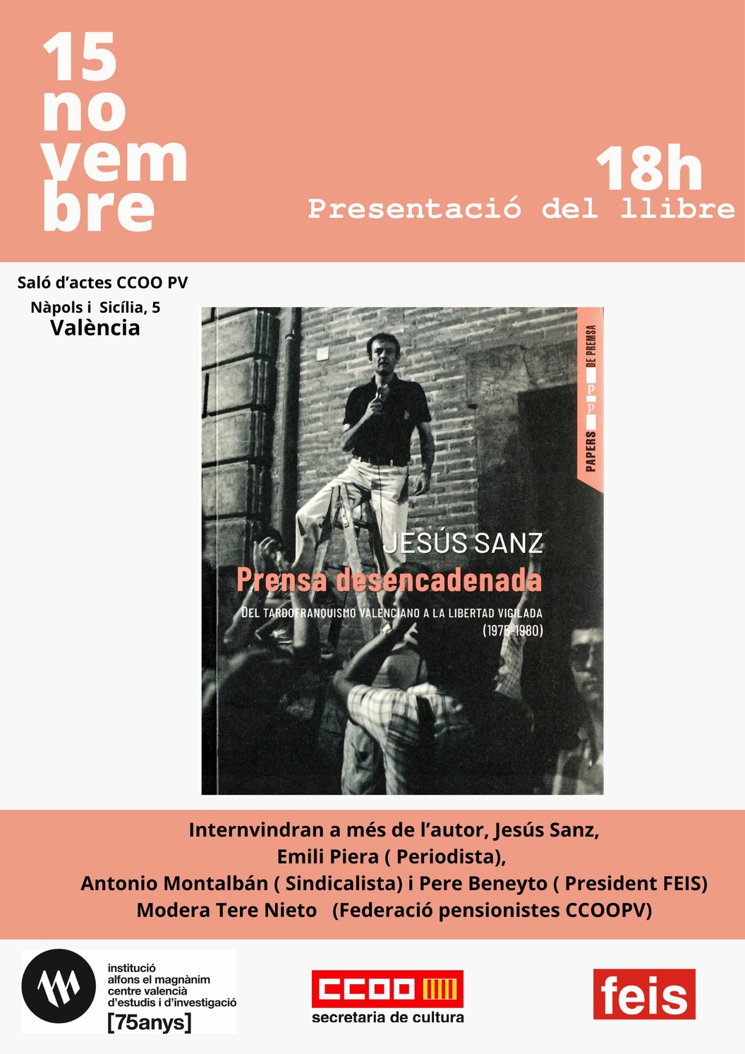 El acte se celebrarà el pròxim dimecres 15 de novembre a les 18:00 hores, en el Saló d’actes CCOO PV, i comptarà amb la participació de Emili Piera (periodista), Antonio Montalbán (sindicalista) i Pere Beneyto (President FEIS). Modera Tere Nieto (Federació pensionistes CCOOPV).